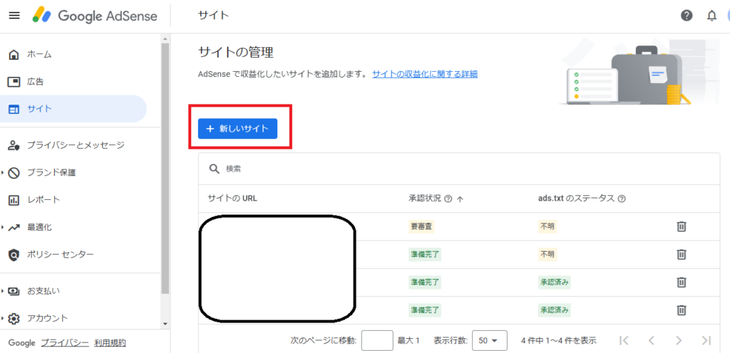 審査をクリアしたサイトは承認状況が準備完了と表示されます。