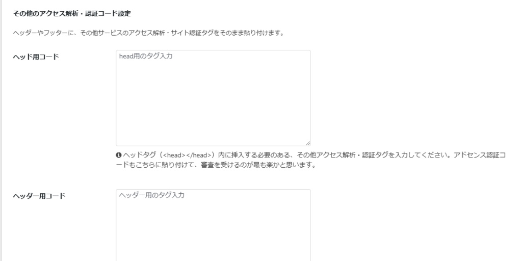 Cocoon設定からアクセス解析・認証タブをクリックすると上記の画面が表示されますので、ヘッド用コードに先ほどコピーしたコードを追記して保存します。