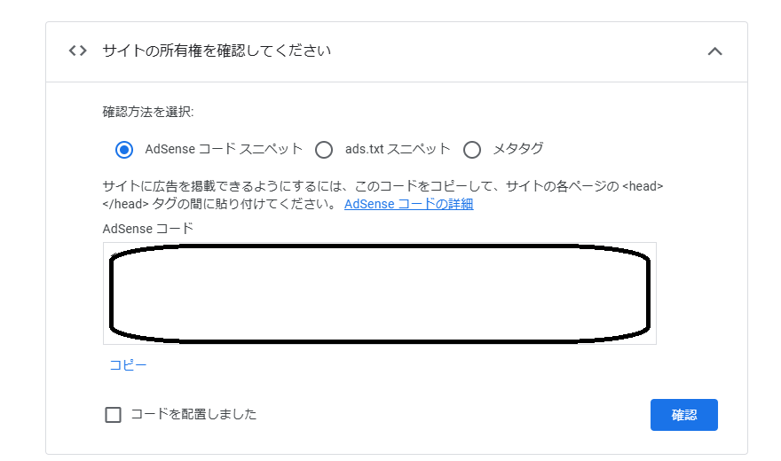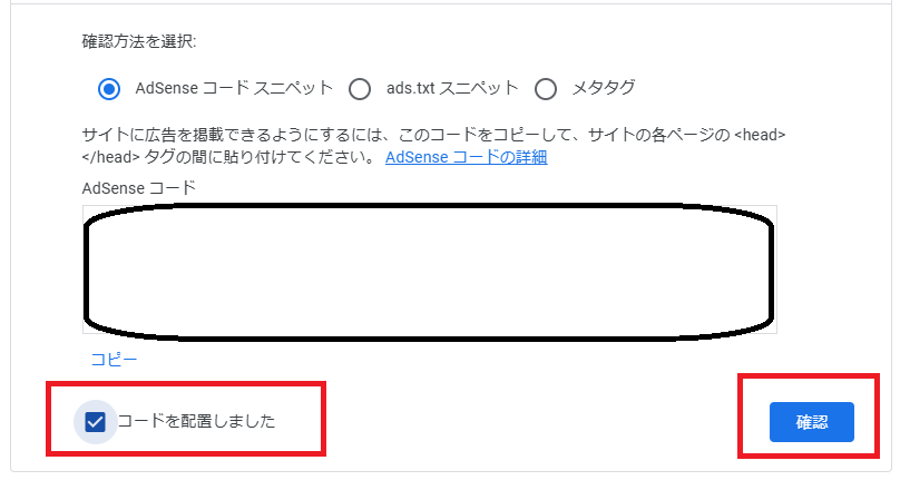 コードを追記したら、Adsenseのコンソールに戻り、コードを配置しましたにチェックを入れて確認をクリックしましょう。
