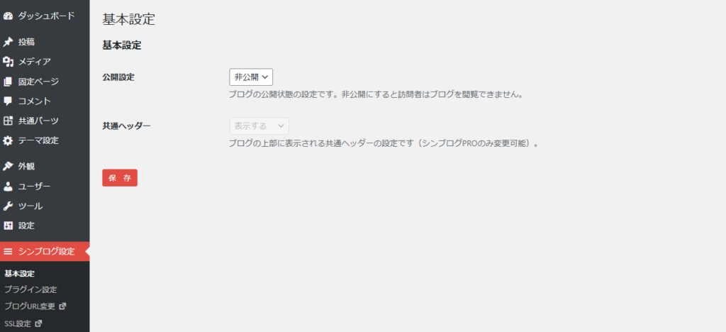 左側メニューのシンブログ設定の基本設定を押すと、公開設定の項目があるので、こちらから設定してください。