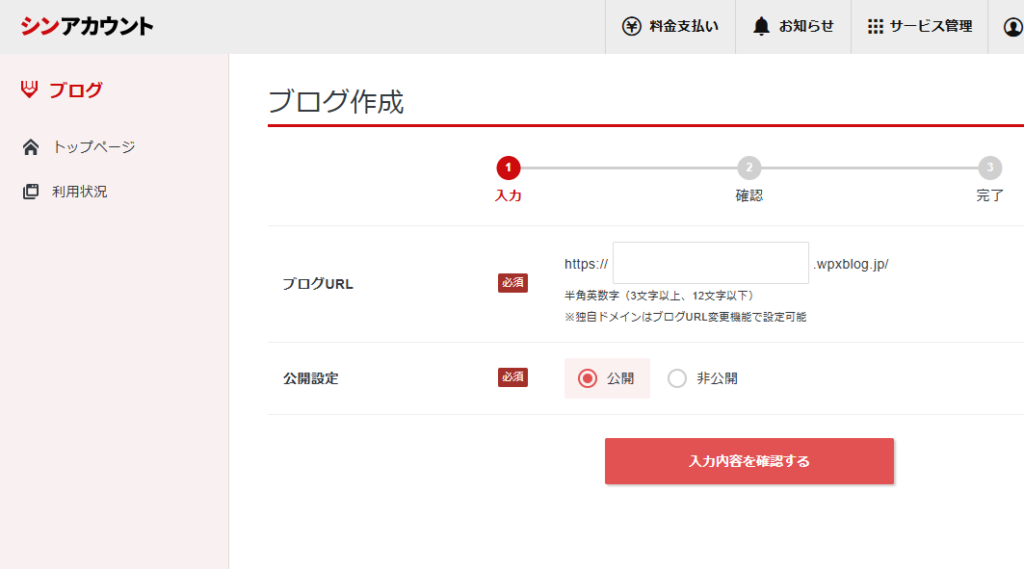 ブログ作成画面になったら、ブログURLに任意のURL文字列を入力します。