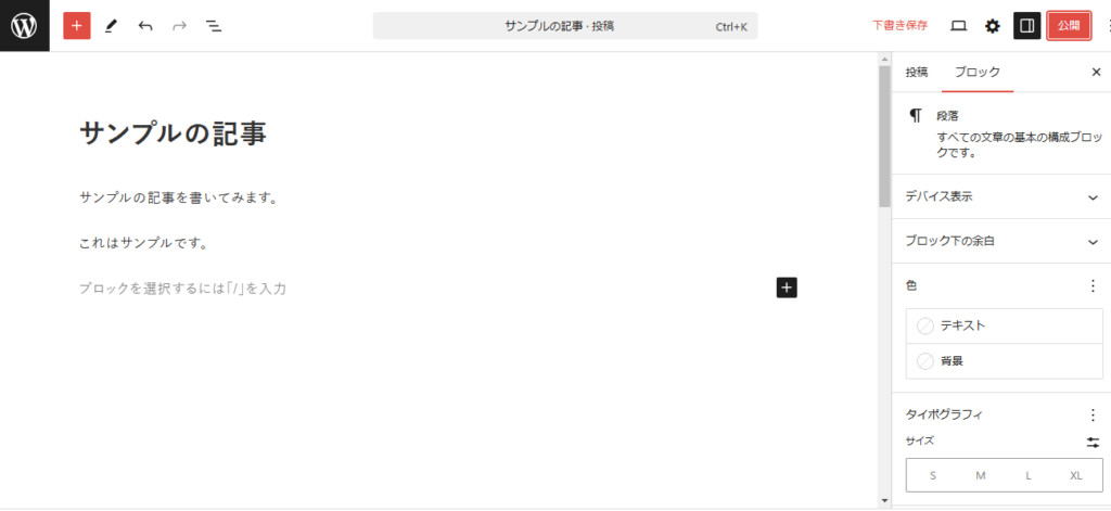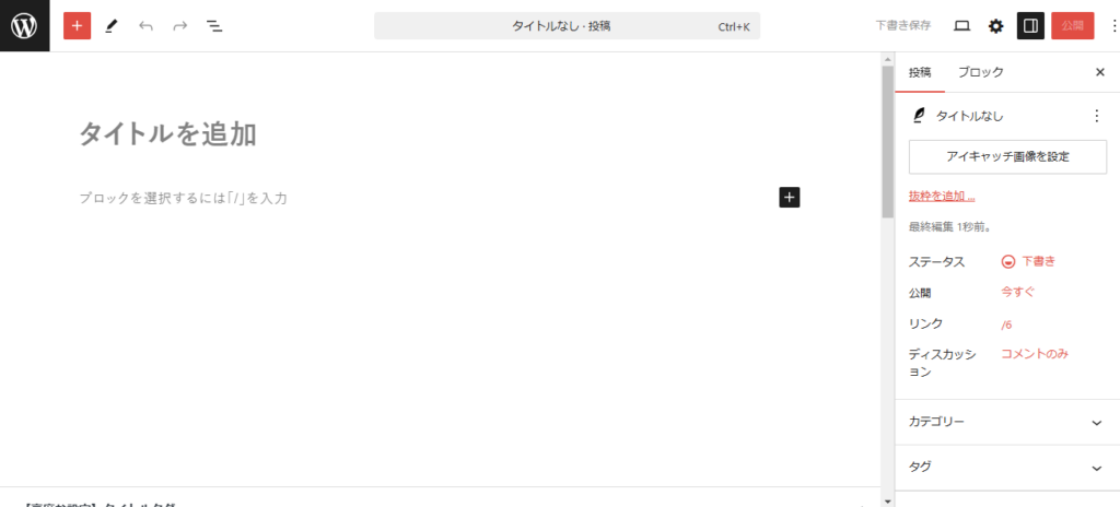 「タイトルを追加」には、記事のタイトル、「ブロックを選択するには「/」を入力」とある部分が、記事の本文を書くところになります。